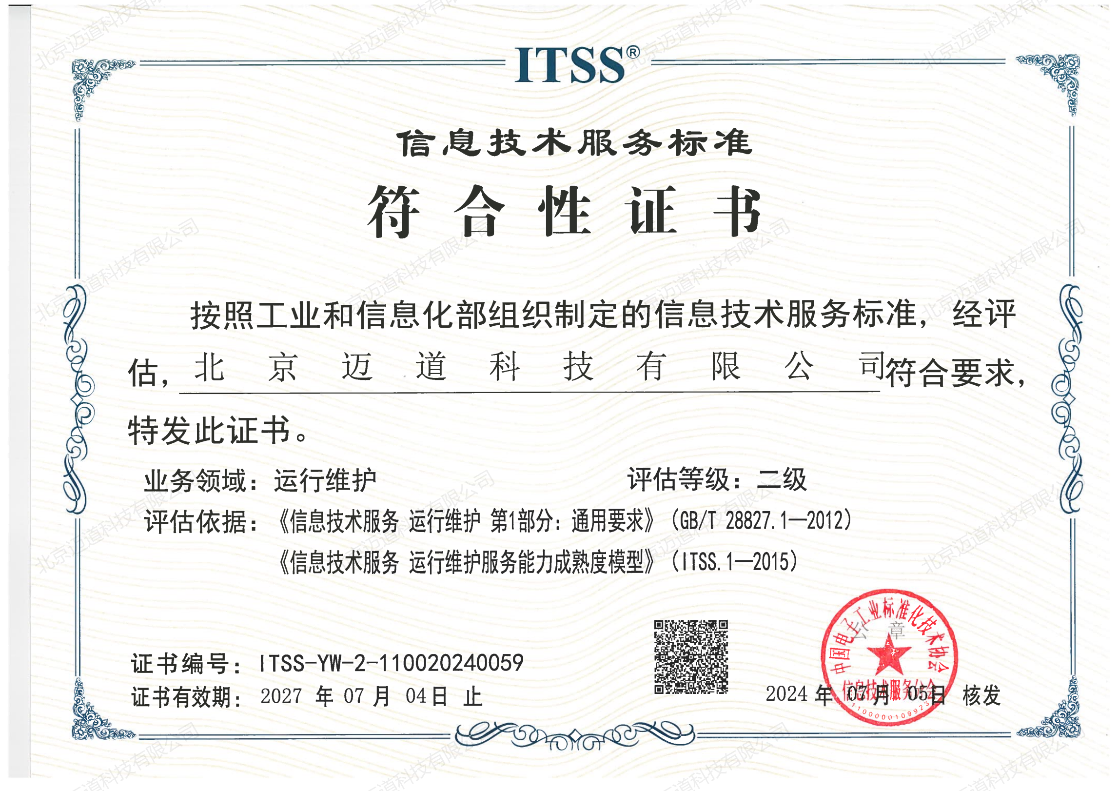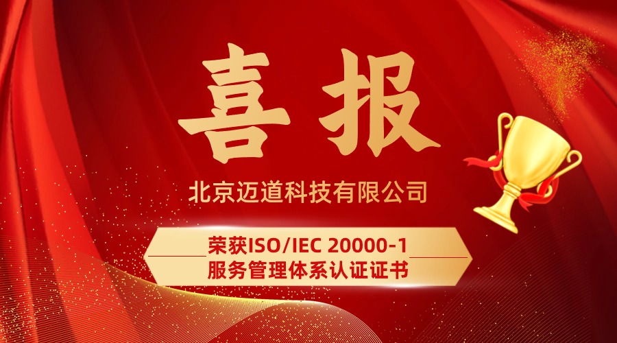 北京邁道科技有限公司,榮獲了基于ISO/IEC 20000-1的服務管理體系認證證書。