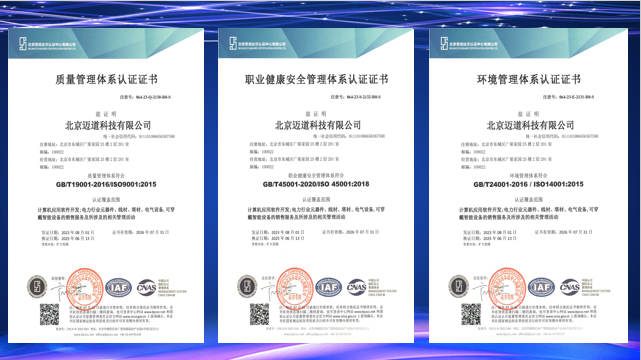 近日,北京邁道科技有限公司正式通過國家權威認證機構審核,一次性獲得ISO 9001質量管理體系、ISO 14001環境管理體系、ISO 45001職業健康安全管理體系認證。