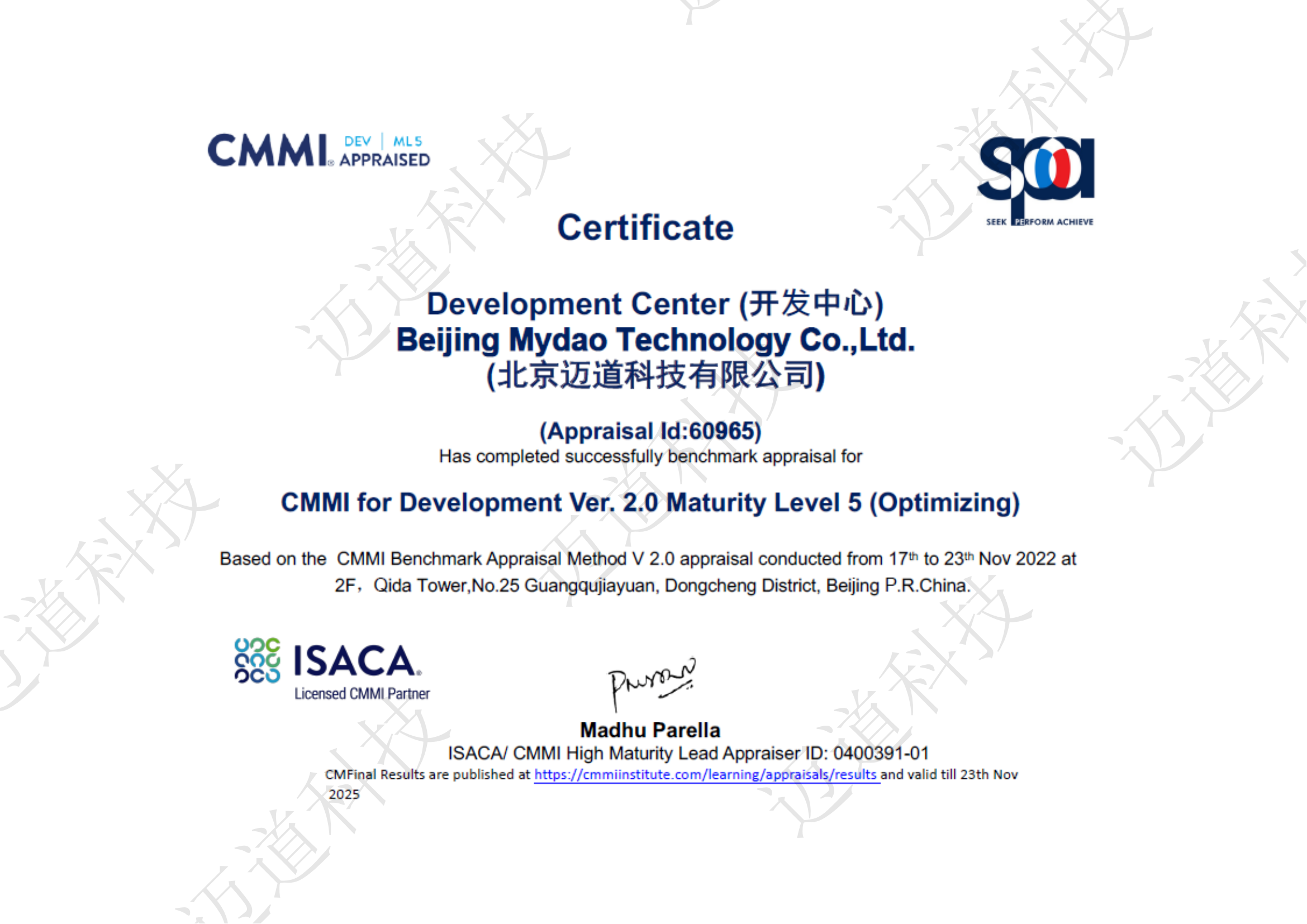 近日,依據CMMI最新版標準評估,北京邁道科技有限公司成功通過全球軟件領域最高級別CMMI 5級認證。標志著邁道科技的軟件研發能力、組織過程能力、項目管理能力在標準化、規范化、成熟度等方面達到國際標準。是邁道科技推進研發管理體系規范化征程上的重要里程碑。