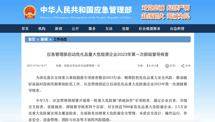 為深化落實全國重大事故隱患專項排查整治2023行動,精準防控危化品重大安全風險,推動做好高溫時段和汛期事故防范工作,應急管理部近日啟動危化品重大危險源企業2023年第一次部級督導核查。