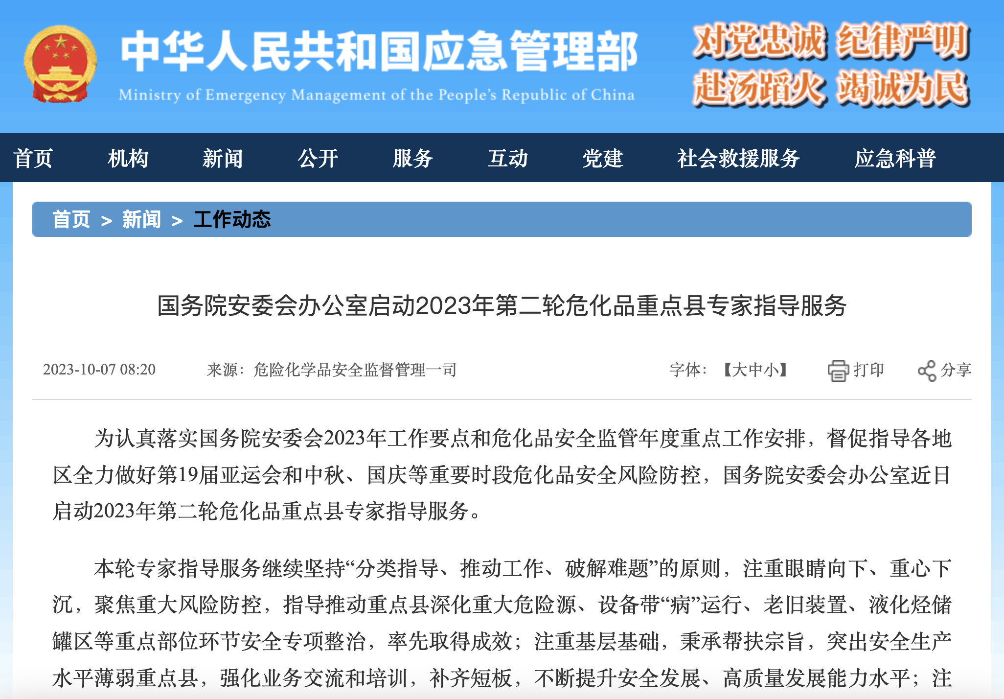為認真落實國務院安委會2023年工作要點和危化品安全監管年度重點工作安排,督促指導各地區全力做好第19屆亞運會和中秋、國慶等重要時段危化品安全風險防控,國務院安委會辦公室近日啟動2023年第二輪危化品重點縣專家指導服務。