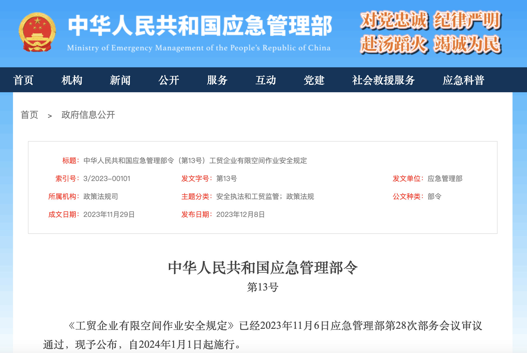 《工貿企業有限空間作業安全規定》已經2023年11月6日應急管理部第28次部務會議審議通過,現予公布,自2024年1月1日起施行。