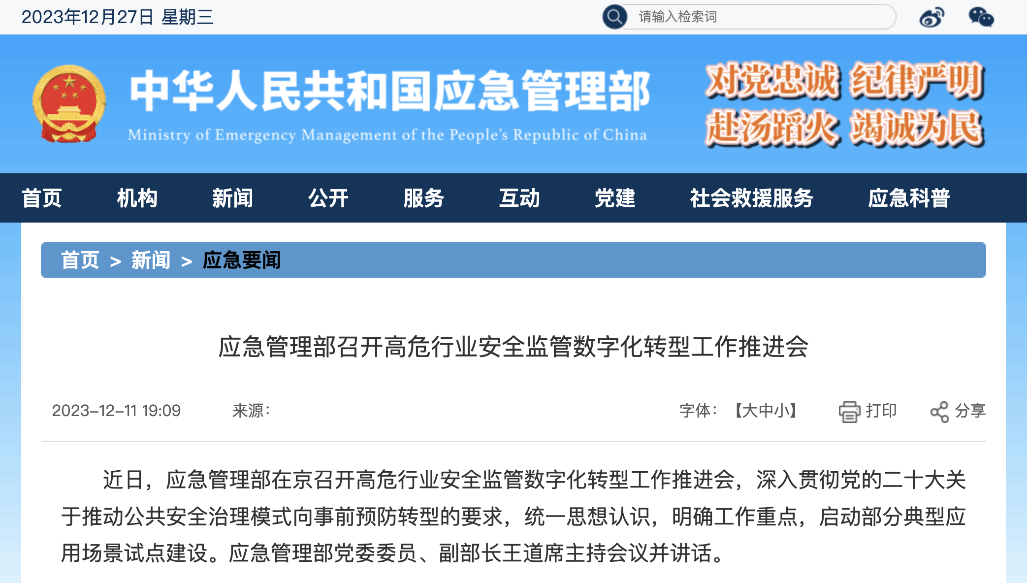 近日,應急管理部在京召開高危行業安全監管數字化轉型工作推進會,深入貫徹黨的二十大關于推動公共安全治理模式向事前預防轉型的要求,統一思想認識,明確工作重點,啟動部分典型應用場景試點建設。應急管理部黨委委員、副部長王道席主持會議并講話。