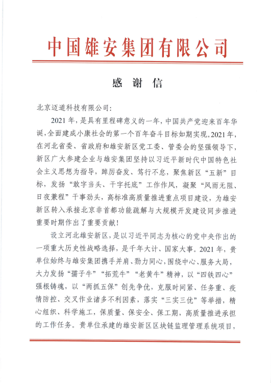 近日(ri),邁道科(ke)技收到來(lai)自中國雄安(an)集(ji)團的(de)感謝信,對公司承建 “雄安(an)集(ji)團區(qu)塊鏈監理系(xi)統”項目取得的(de)成績給(gei)予了充分(fen)肯定和高度贊(zan)揚。