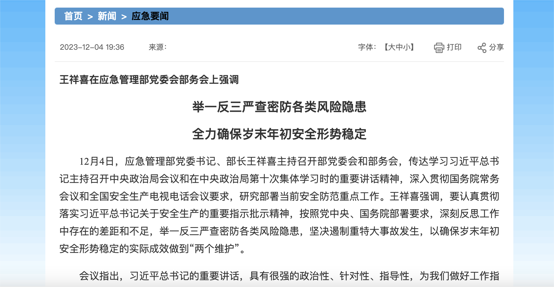 12月4日,應急管理部黨委書記、部長王祥喜主持召開部黨委會和部務會,傳達學習習近平總書記主持召開中央政治局會議和在中央政治局第十次集體學習時的重要講話精神,深入貫徹國務院常務會議和全國安全生產電視電話會議要求,研究部署當前安全防范重點工作。王祥喜強調,要認真貫徹落實習近平總書記關于安全生產的重要指示批示精神,按照黨中央、國務院部署要求,深刻反思工作中存在的差距和不足,舉一反三嚴查密防各類風險隱患,堅決遏制重特大事故發生,以確保歲末年初安全形勢穩定的實際成效做到“兩個維護”。