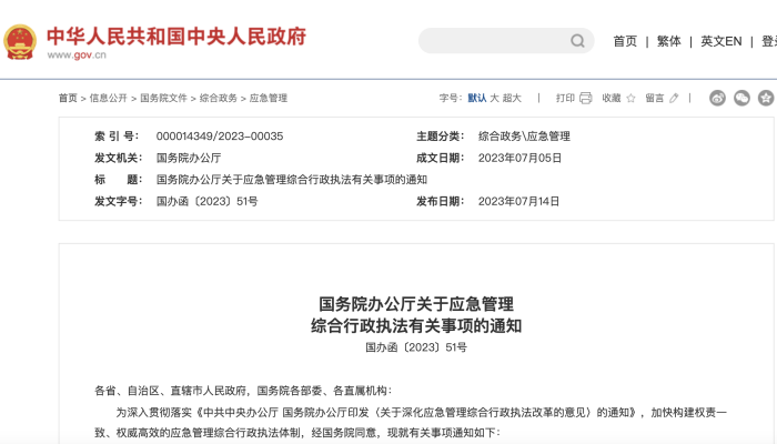 為深入貫徹落實《中共中央辦公廳 國務院辦公廳印發〈關于深化應急管理綜合行政執法改革的意見〉的通知》,加快構建權責一致、權威高效的應急管理綜合行政執法體制,經國務院同意,現就有關事項通知如下: