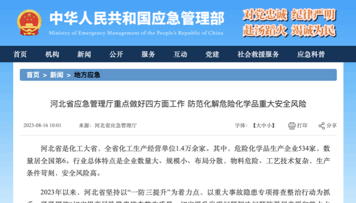 為深化落實全國重大事故隱患專項排查整治2023行動,精準防控危化品重大安全風險,推動做好高溫時段和汛期事故防范工作,應急管理部近日啟動危化品重大危險源企業2023年第一次部級督導核查。