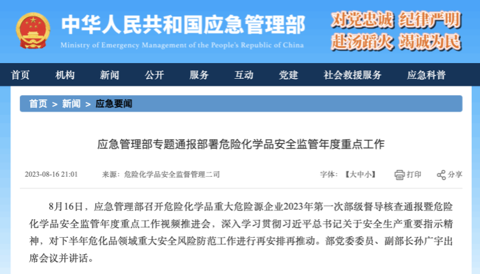 8月16日,應急管理部召開危險化學品重大危險源企業2023年第一次部級督導核查通報暨危險化學品安全監管年度重點工作視頻推進會,深入學習貫徹習近平總書記關于安全生產重要指示精神,對下半年危化品領域重大安全風險防范工作進行再安排再推動。部黨委委員、副部長孫廣宇出席會議并講話。
