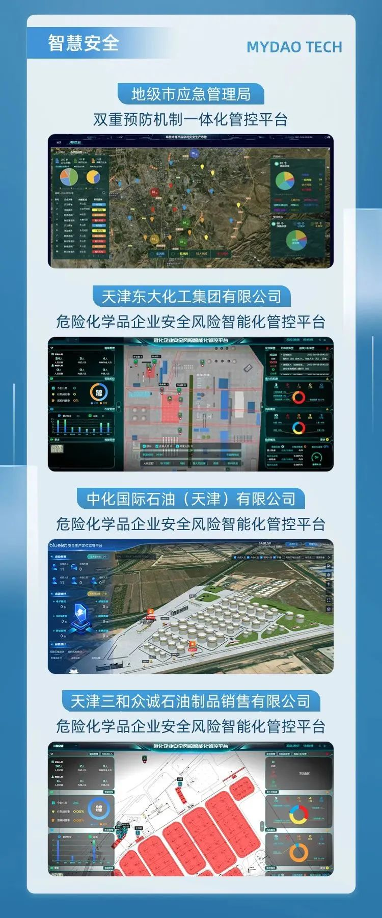 邁道科技作為國內領先的大安全產業運營服務商,深耕應急危化領域多年,聚焦各級應急管理機構、化工園區管委會、安全生產企業等重點難點問題和薄弱環節動,充分利用新一代信息技術,創新研發“安質保-智慧安全生產云”平臺。